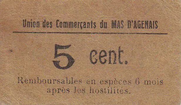 Billet France 5 Centimes Le Mas d'Agenais Union des Commerçants
