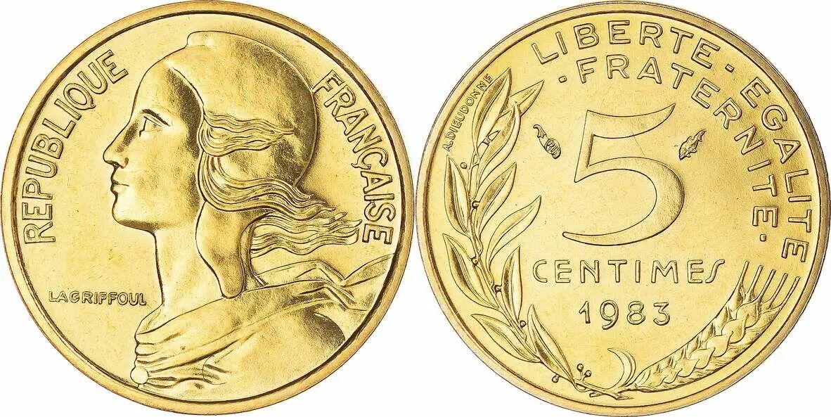 The 1983 Marianne 5 centime coin is an issue of the French Republic. This coin is struck from an alloy of copper, aluminum, and nickel. It weighs 2 grams and has a diameter of 17 millimeters.
