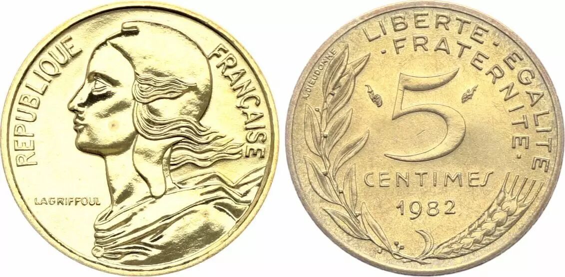La pièce de 5 centimes Marianne est une pièce de monnaie française. Elle est composée d'un alliage de cuivre, d'aluminium et de nickel. Son poids est de 2 grammes et son diamètre mesure 17 millimètres. La tranche de la pièce est lisse.