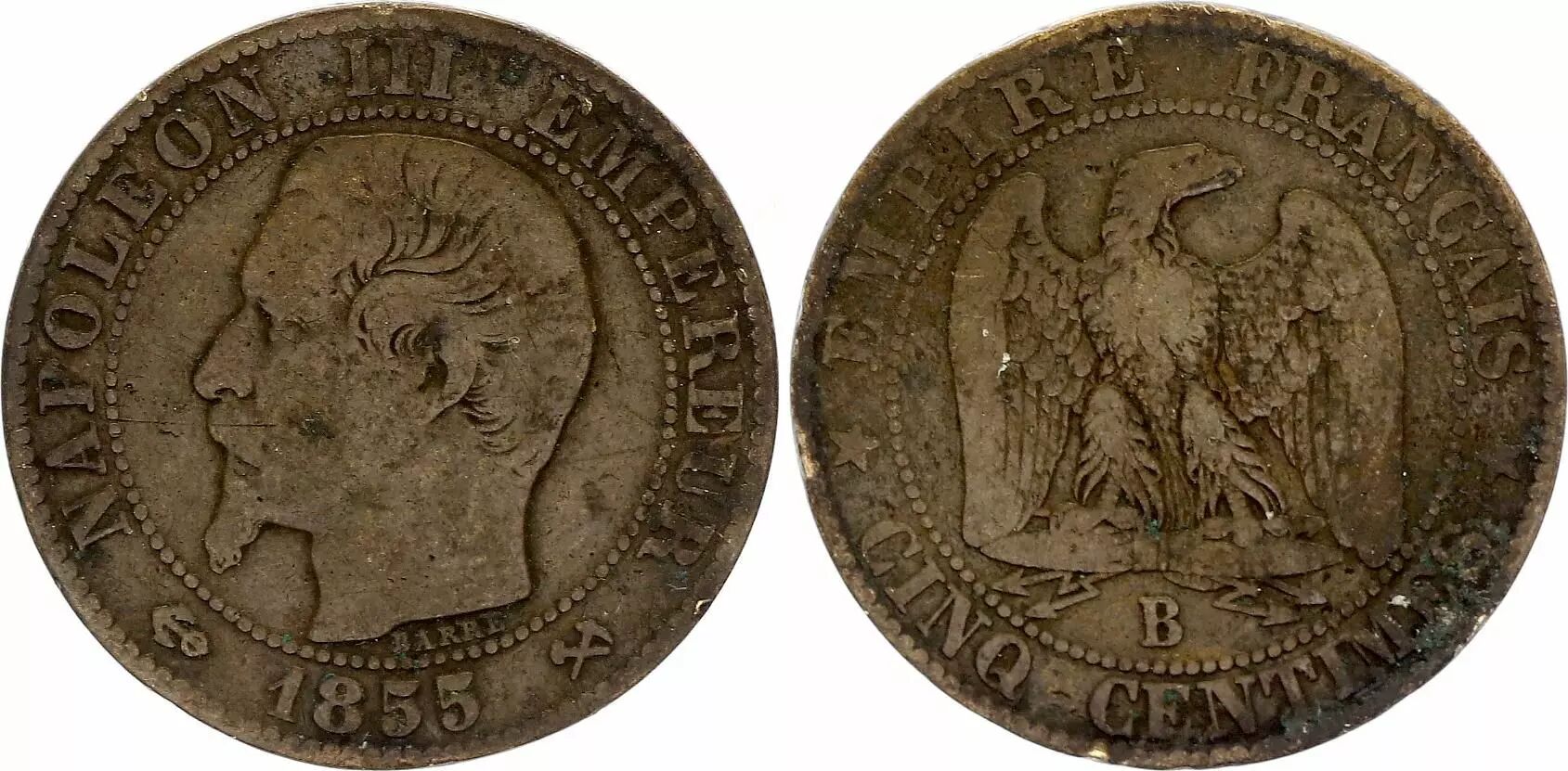 Pièce France 5 Centimes Napoléon III - Tête Nue -1855 B Rouen