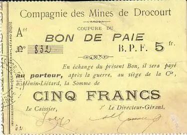 Billet France 5 F Drocourt Cie. des mines Bon de paie