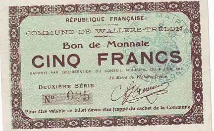 Billet France 5 F Wallers-Trelon Bon de monnaie