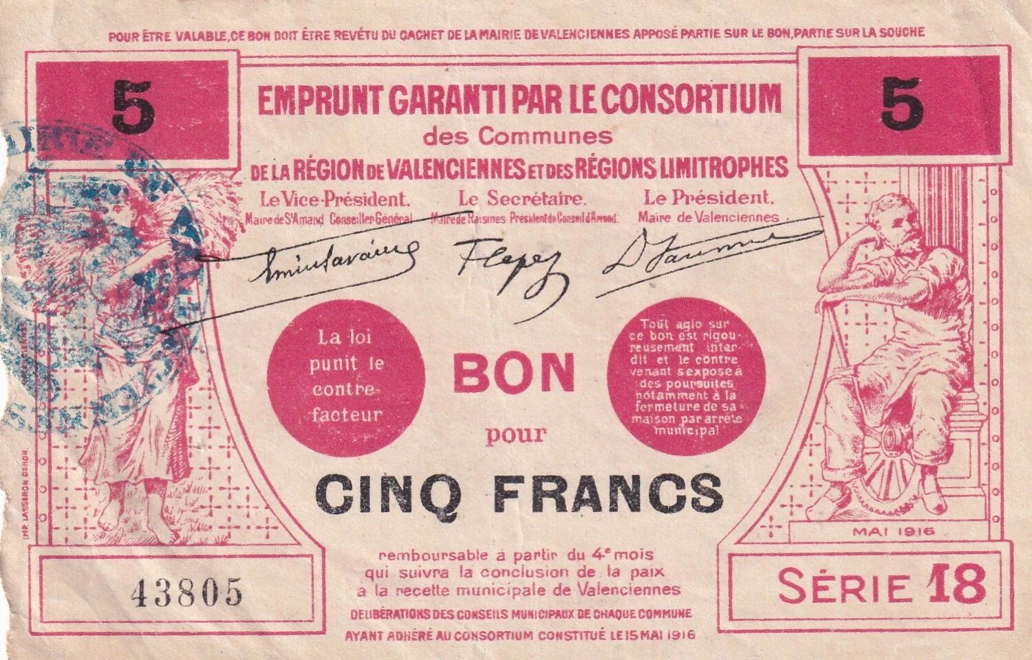 Valenciennes, heavily affected by the German occupation, put these notes into circulation to maintain economic exchanges and support the population. This issue is part of the ?loan guaranteed by the consortium of communes of the Valenciennes region and neighboring regions?, a collective mechanism aimed at ensuring the trust and circulation of these notes.