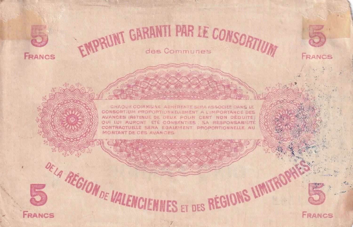 Valenciennes, heavily impacted by the German occupation, issued these notes to maintain economic exchanges and support the population. This issue is part of the ?loan guaranteed by the consortium of communes of the Valenciennes region and surrounding areas?, a collective system designed to ensure the credibility and circulation of these notes.