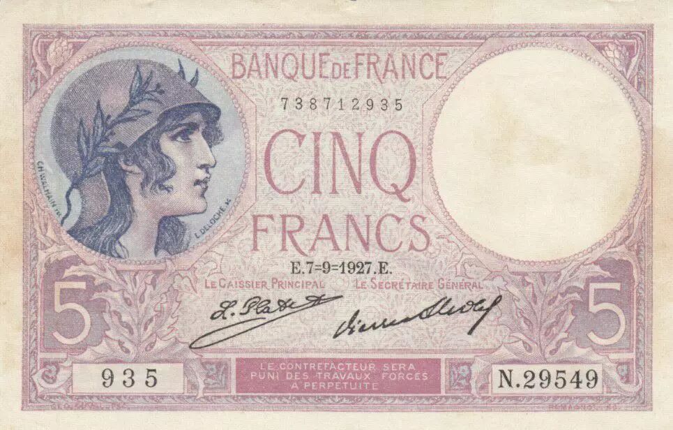 Home > > France 5 Francs 07-08-1927 Serial N.29549 - VF to XF