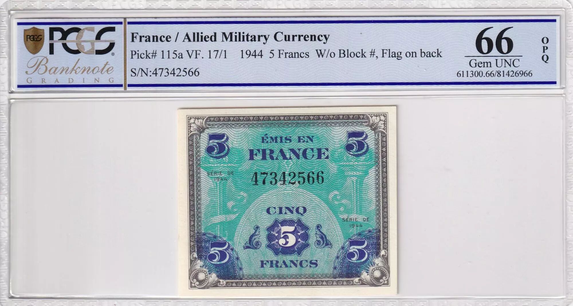 Home > > France 5 Francs Allied Military Currency - Flag - 1944 - PCGS 66 OPQ