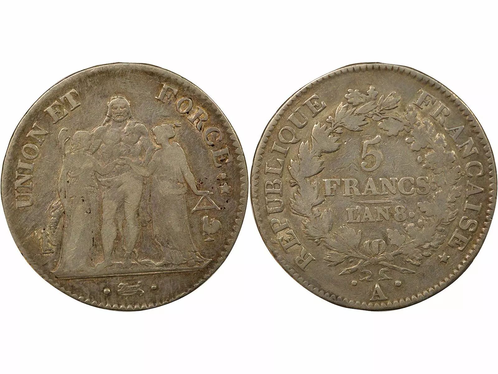 Pièce France 5 Francs Argent, Union & Force - An 8 A Paris