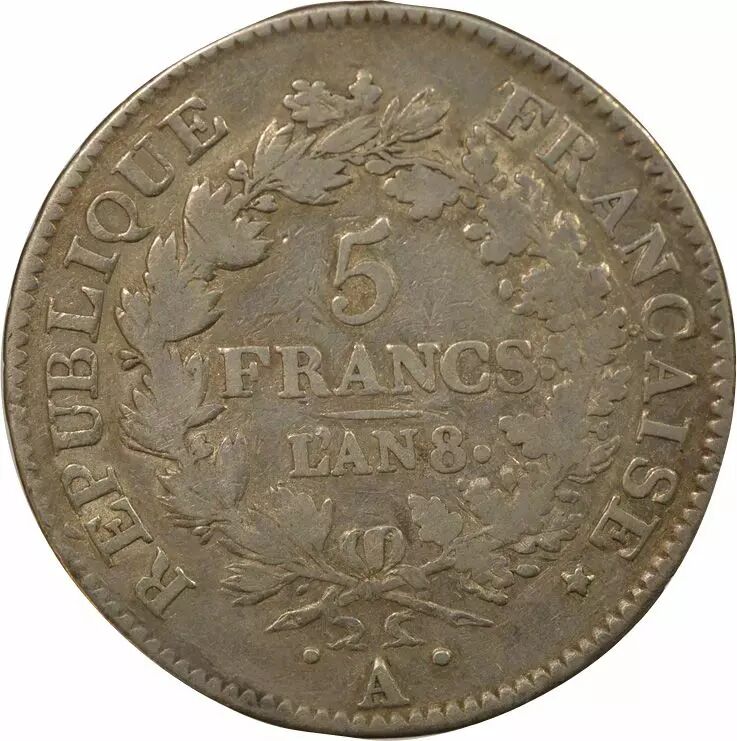 Accueil > Archivage > archivage-Monnaies françaises (470 à 2002) > France 5 Francs Argent, Union & Force - An 8 A Paris