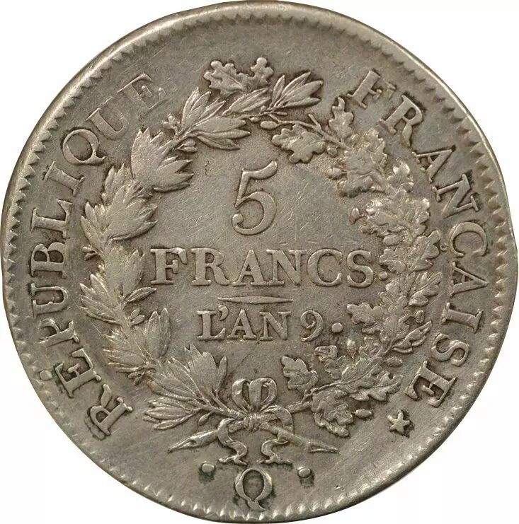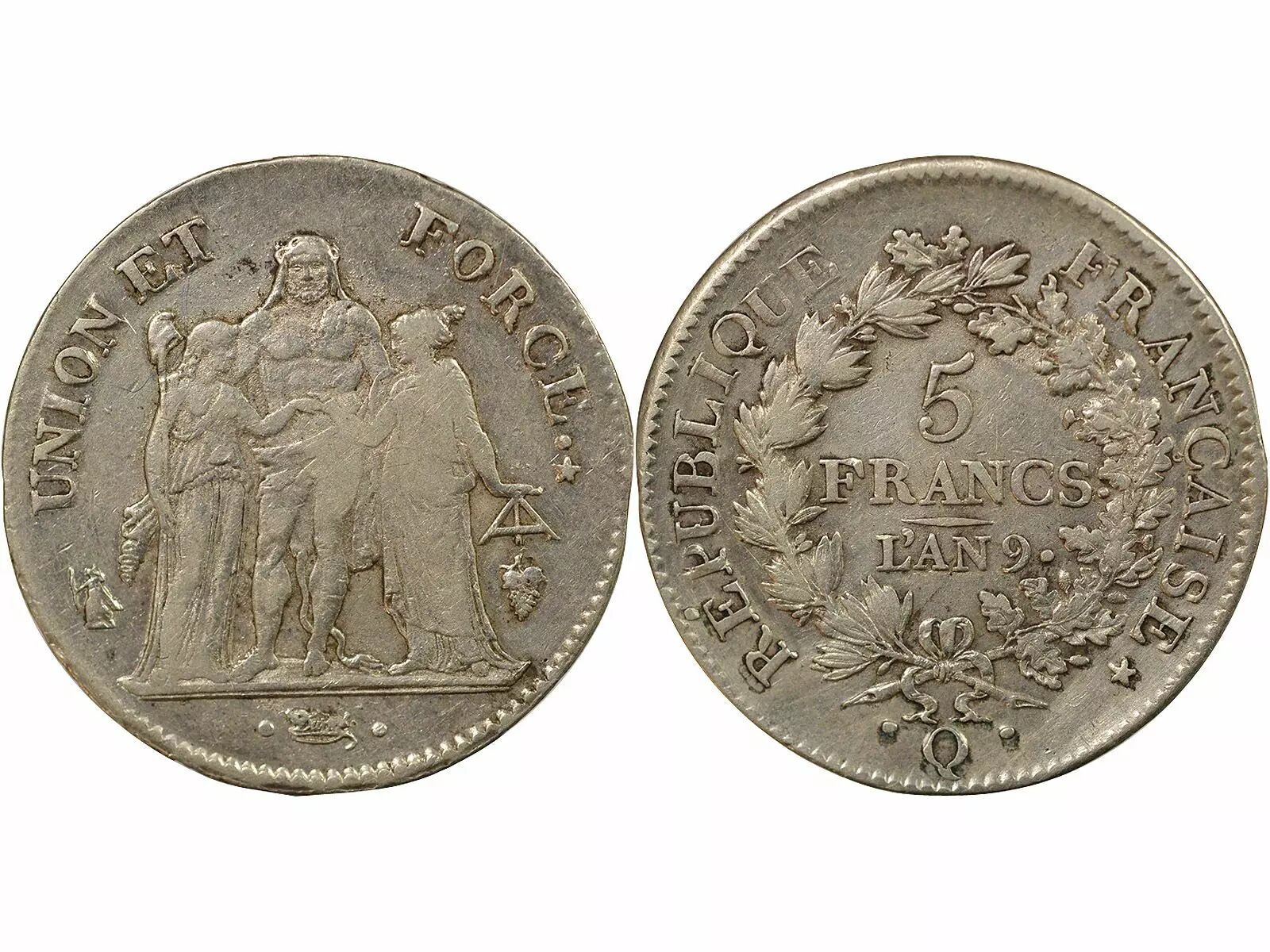 Pièce France 5 Francs Argent, Union & Force - An 9 Q Perpignan