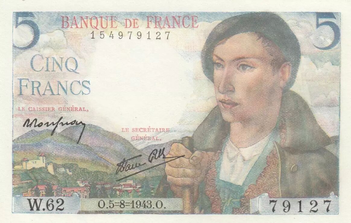 Billet France 5 Francs - Berger - 05-08-1943 - Série W.62