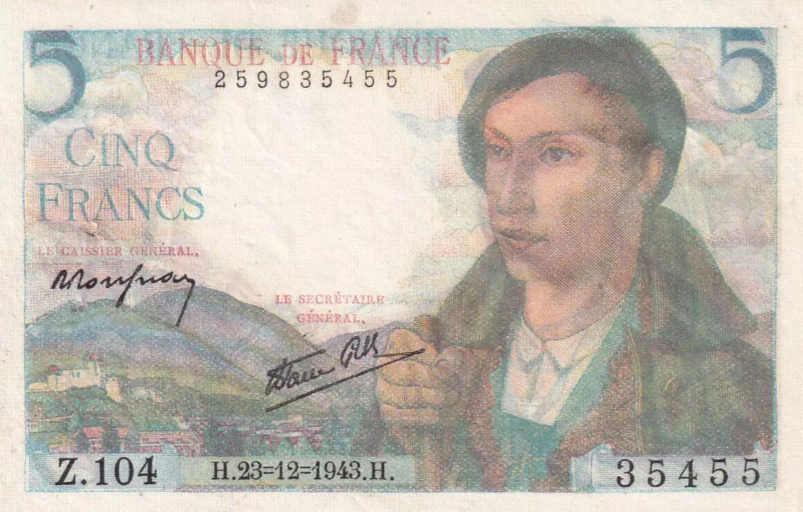 Billet France 5 Francs Berger - 23-12-1943 Série Z.104