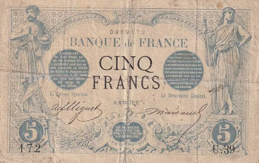 This French 5 Franc banknote, commonly known as "Noir" (Black), was issued on January 1, 1872. It belongs to the U.39 series.