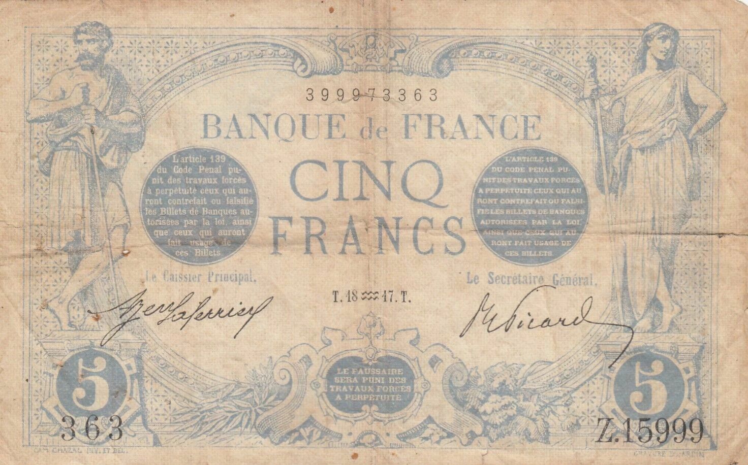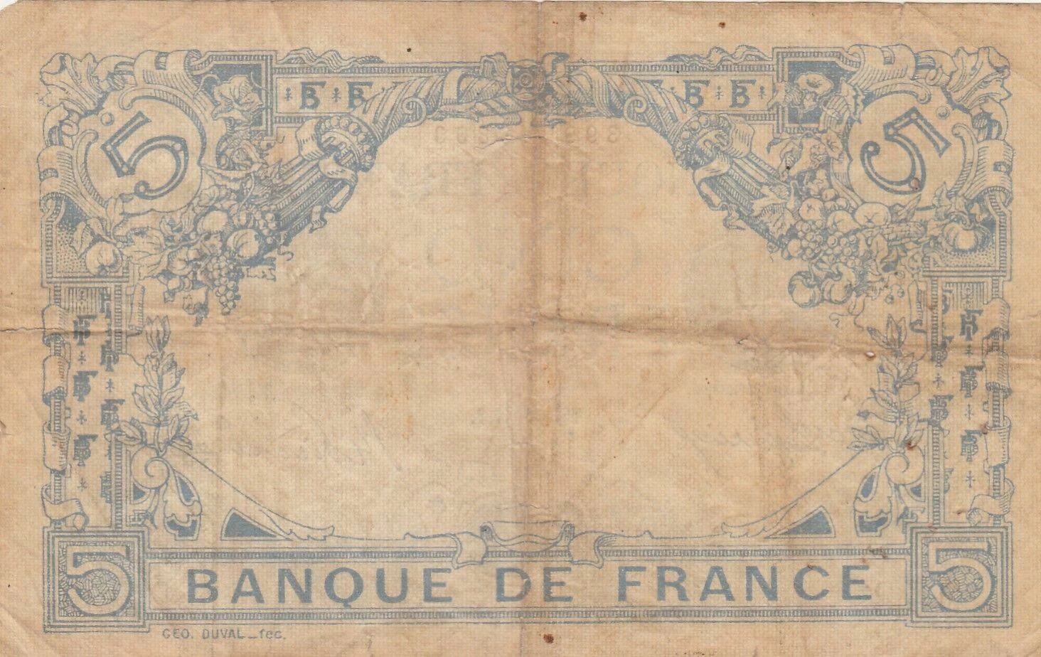 Le recto du billet présente une composition allégorique complexe. Au centre, une figure féminine drapée, symbolisant la France, est assise et tient un bouclier orné des fleurs de lys. À ses côtés, un enfant représente l'avenir et la prospérité. L'arrière-plan est constitué d'éléments architecturaux classiques, évoquant la grandeur et l'histoire de la nation. La couleur dominante est le bleu, ce qui lui vaut son surnom de "Bleu". La valeur faciale, "5 Francs", est clairement indiquée en toutes lettres et en chiffres.