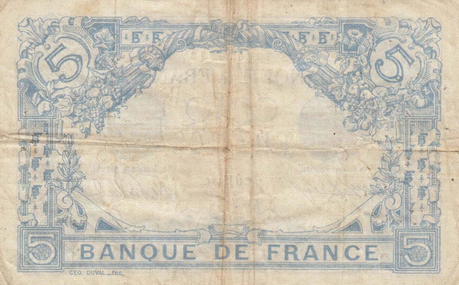Au verso, on retrouve la valeur faciale "5" mise en évidence au centre d'un ensemble décoratif. La mention "CINQ FRANCS" est répétée. Le texte "L'ARTICLE 139 DU CODE PENAL PUNIT DE LA RECLUSION CEUX QUI AURONT CONTREFAIT OU FALSIFIE LES BILLETS DE BANQUE AUTORISES PAR LA LOI, AINSI QUE CEUX QUI AURONT FAIT USAGE DE CES BILLETS CONTREFAITS OU FALSIFIES. CEUX QUI LES AURONT INTRODUITS EN FRANCE SERONT PUNIS DE LA MEME PEINE." est imprimé, rappelant les sanctions pénales en cas de contrefaçon. Le nom de la banque émettrice, "BANQUE DE FRANCE", est également présent.