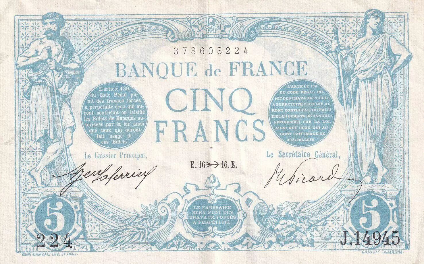 Accueil > Archivage > France 5 Francs - Bleu - 1916 - Série J.14945 - F.02.45