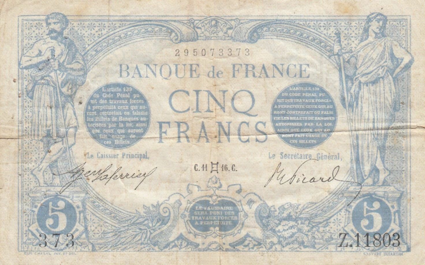 This French banknote was issued on May 11, 1916. It is a 5 franc banknote, recognizable by its dominant blue color.