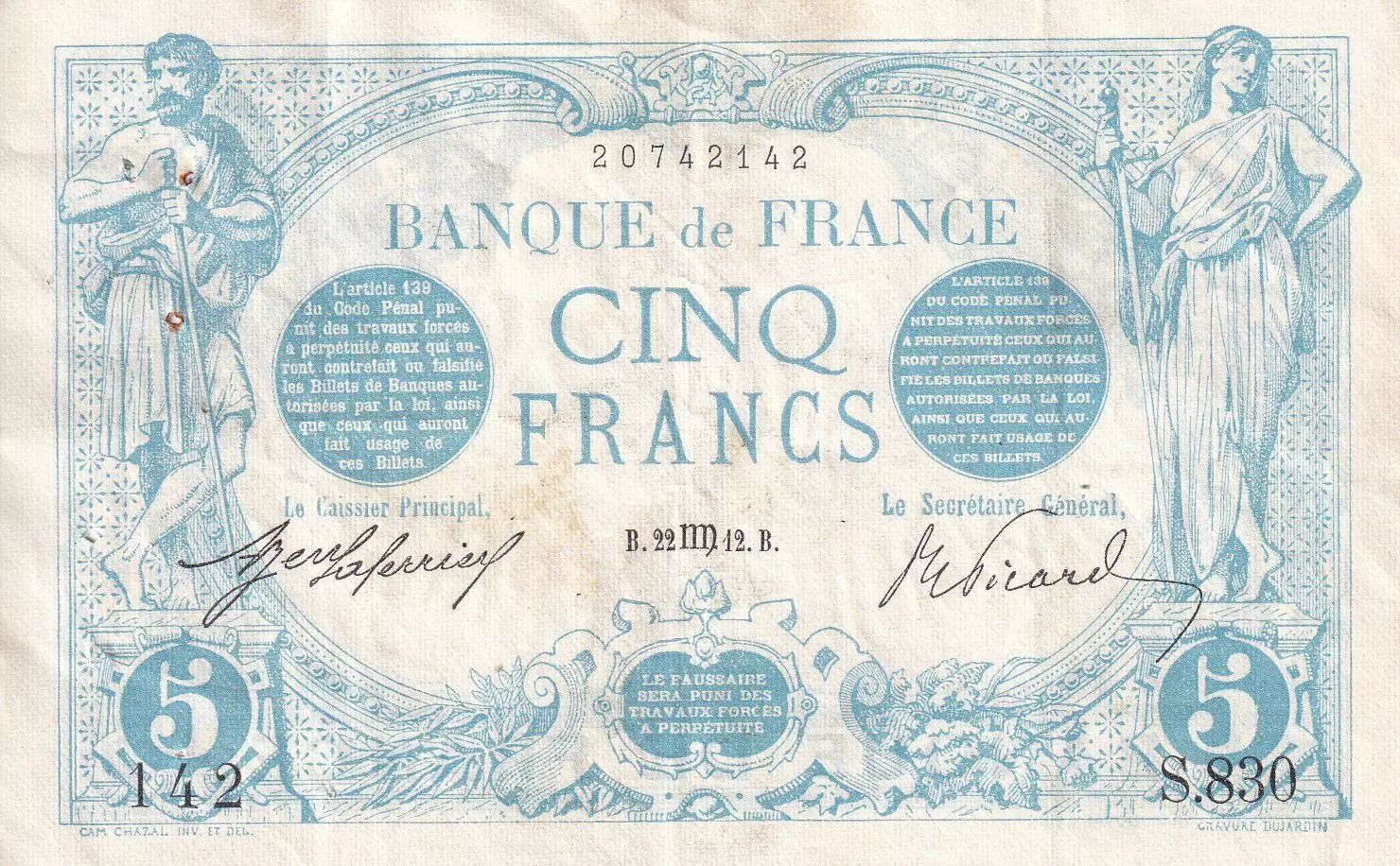 Home > > France 5 Francs - Blue - 22-08-1912 - Serial S.830 - VF to XF - P.70