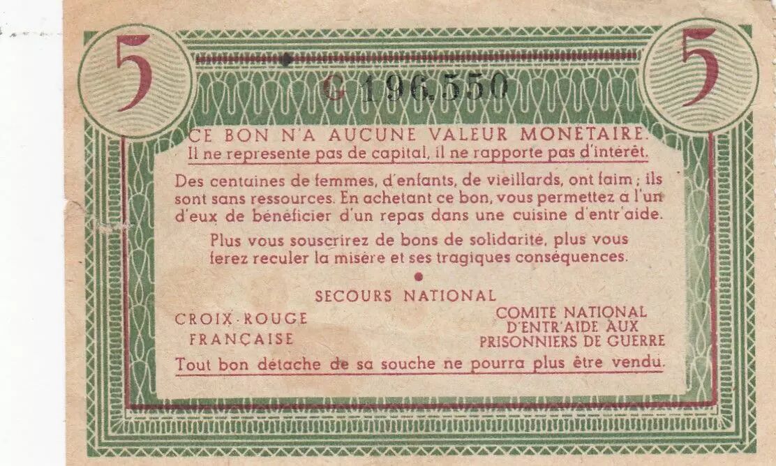 Accueil > Archivage > France 5 Francs Bon de Solidarité Repas de Famille 1941-1942 - Série G 196550