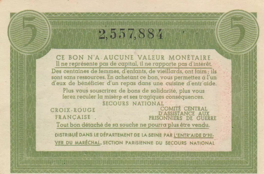 Home > > France 5 Francs Bon de Solidarité - WWII - 1941-1942 - n°2.557.884