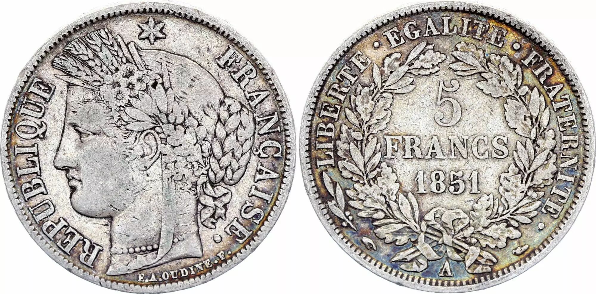 Coin France 5 Francs Ceres - 1851 A Paris - Silver - VF