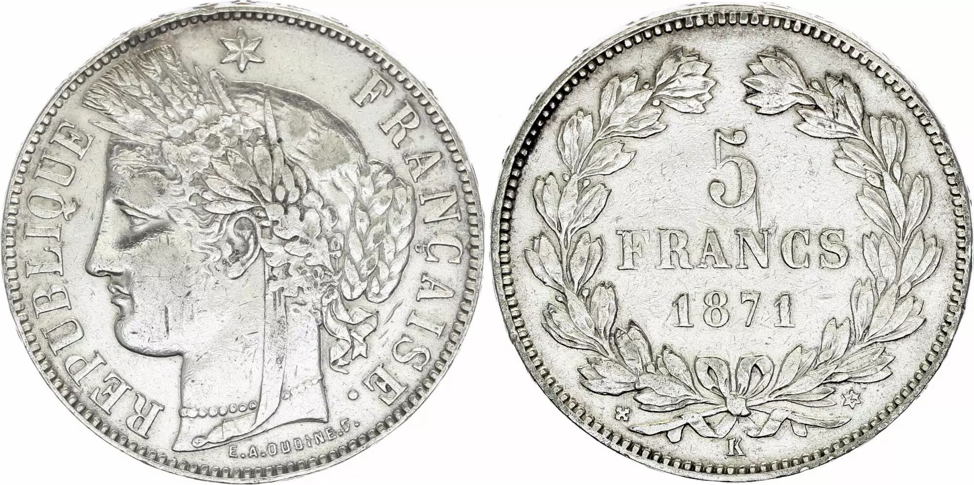 Pièce France 5 Francs Cérès - IIIe Republique - 1871 K Bordeaux