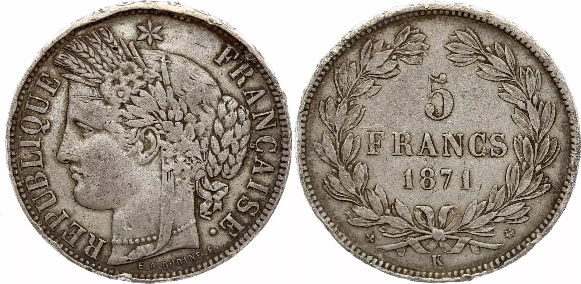 Pièce France 5 Francs Cérès - IIIeme République - 1871 K Bordeaux