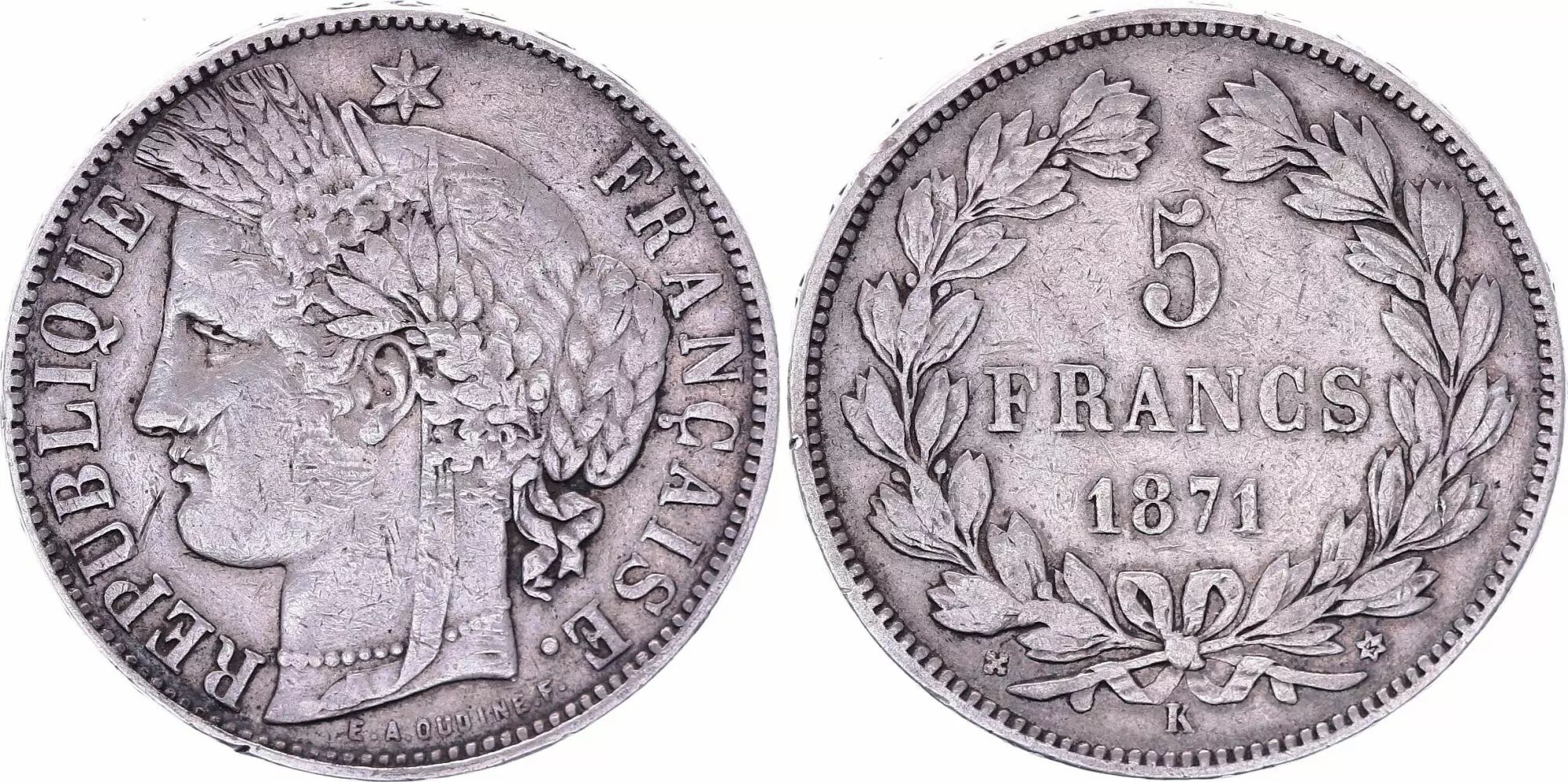 La pièce de 5 Francs Cérès, frappée en argent, a été émise en 1871 par l'atelier de Bordeaux, identifié par la lettre K. Cette pièce commémorative appartient à la période de la Troisième République française.