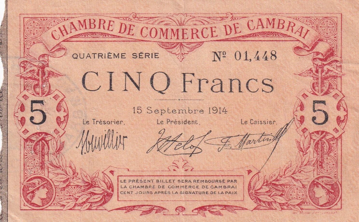 Le billet est daté du 15 septembre 1914. Il porte le numéro de série 01.448. Des signatures manuscrites sont apposées sur le billet, authentifiant son émission par les autorités compétentes de la Chambre de Commerce de Cambrai.
