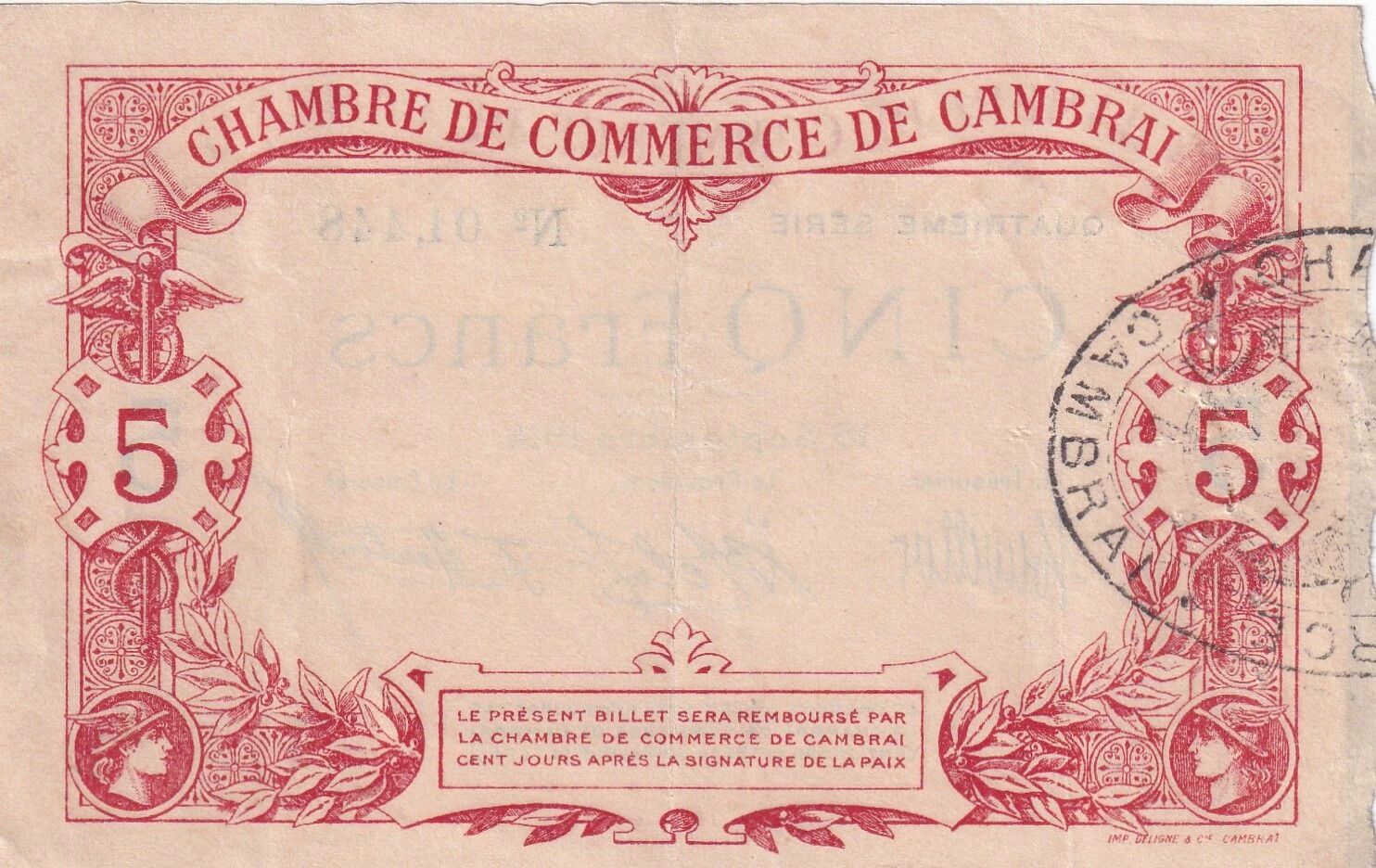 Ce billet de banque français est émis par la Chambre de Commerce de Cambrai. Il appartient à la quatrième série de cette émission locale. Sa valeur nominale est de cinq francs.
