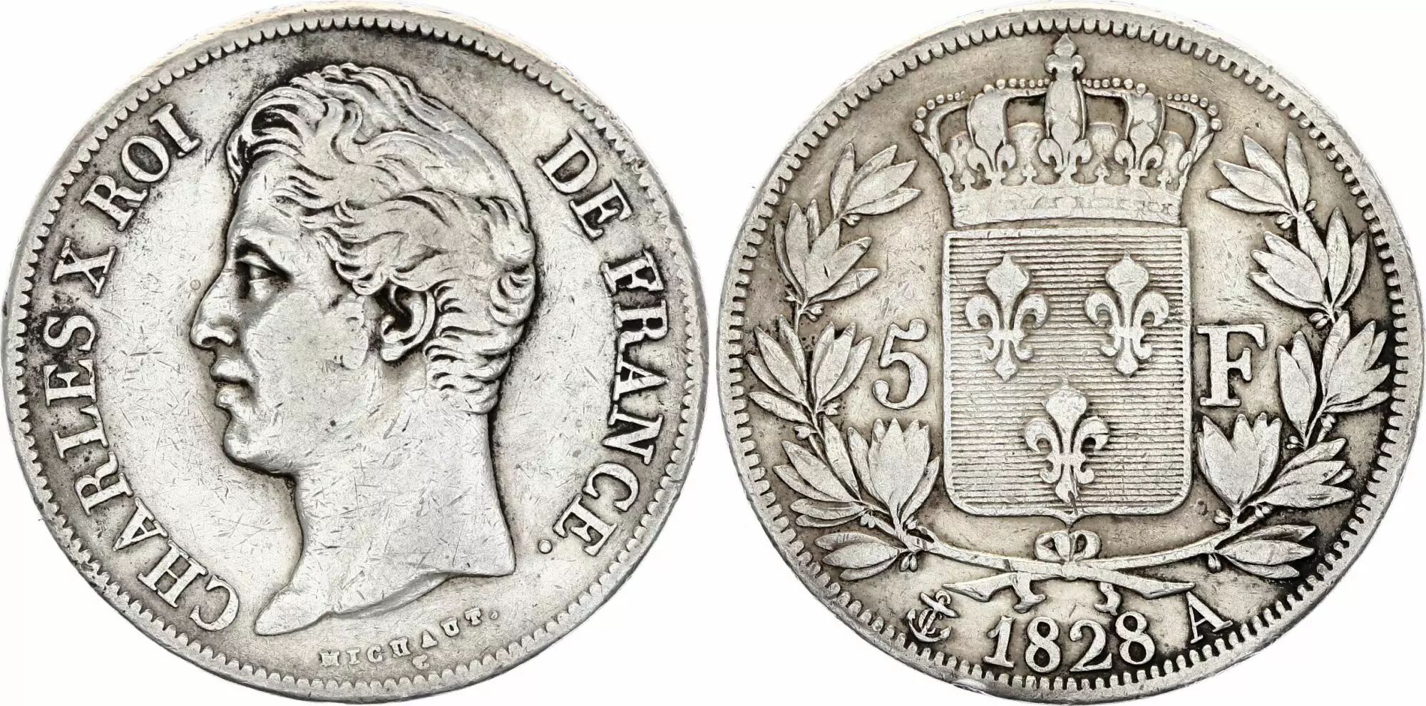 The 5-franc silver coin of 1828 featuring Charles X, minted in Paris and marked with the "A" mint mark, is a valuable piece of French numismatics from the Restoration era. This silver coin, with a diameter of 37 millimeters and a weight of 25 grams, adheres to the standards of the period and is highly sought after by collectors for its historical and aesthetic value.