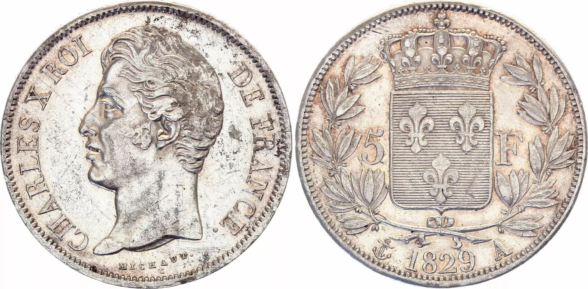 Cette pièce de monnaie est une pièce de 5 francs français, datant de 1829. Frappée à l'atelier monétaire de Paris, elle est associée au règne de Charles X.