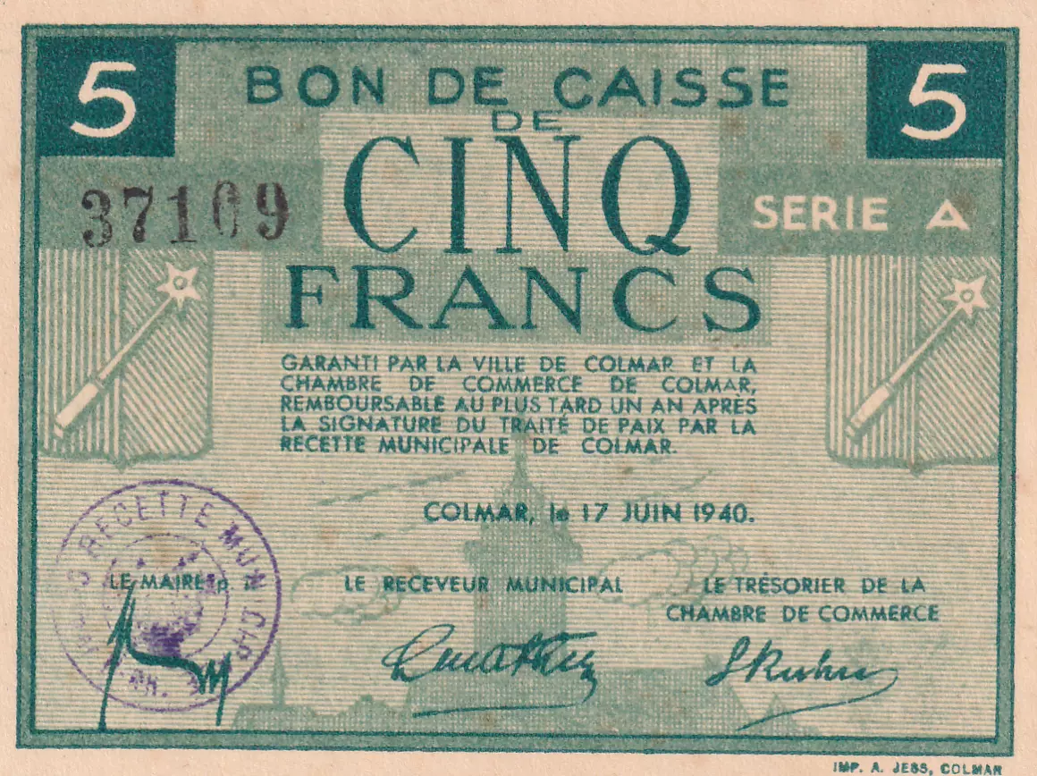 Colmar Chambre de Commerce, serial A - 1940 Issuing date : 1940
