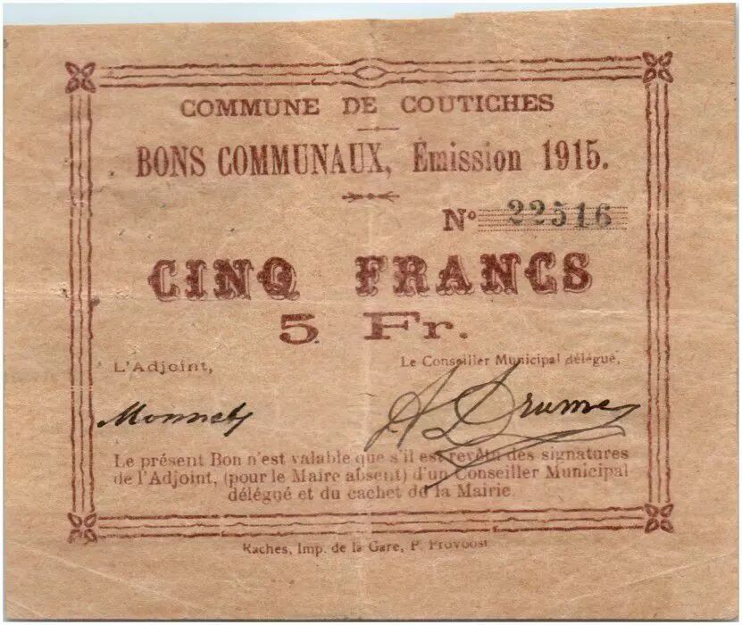 Home > > France 5 Francs Coutiches City - 1915