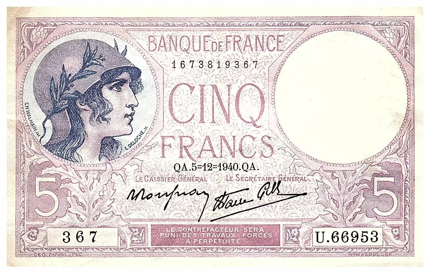 Accueil > Archivage > France 5 Francs Femme casquée modifiée - 05-12-1940 - Série U.66953 - F.04.16