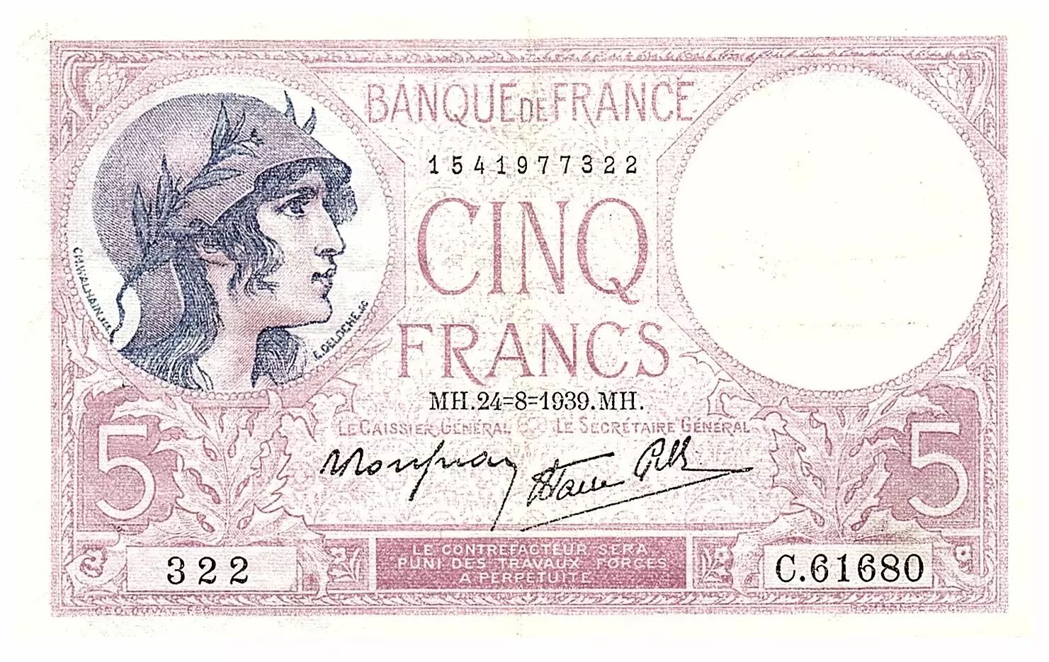 Accueil > Archivage > France 5 Francs Femme casquée modifiée - 24-08-1939 - Série C.61680 - F.04.07