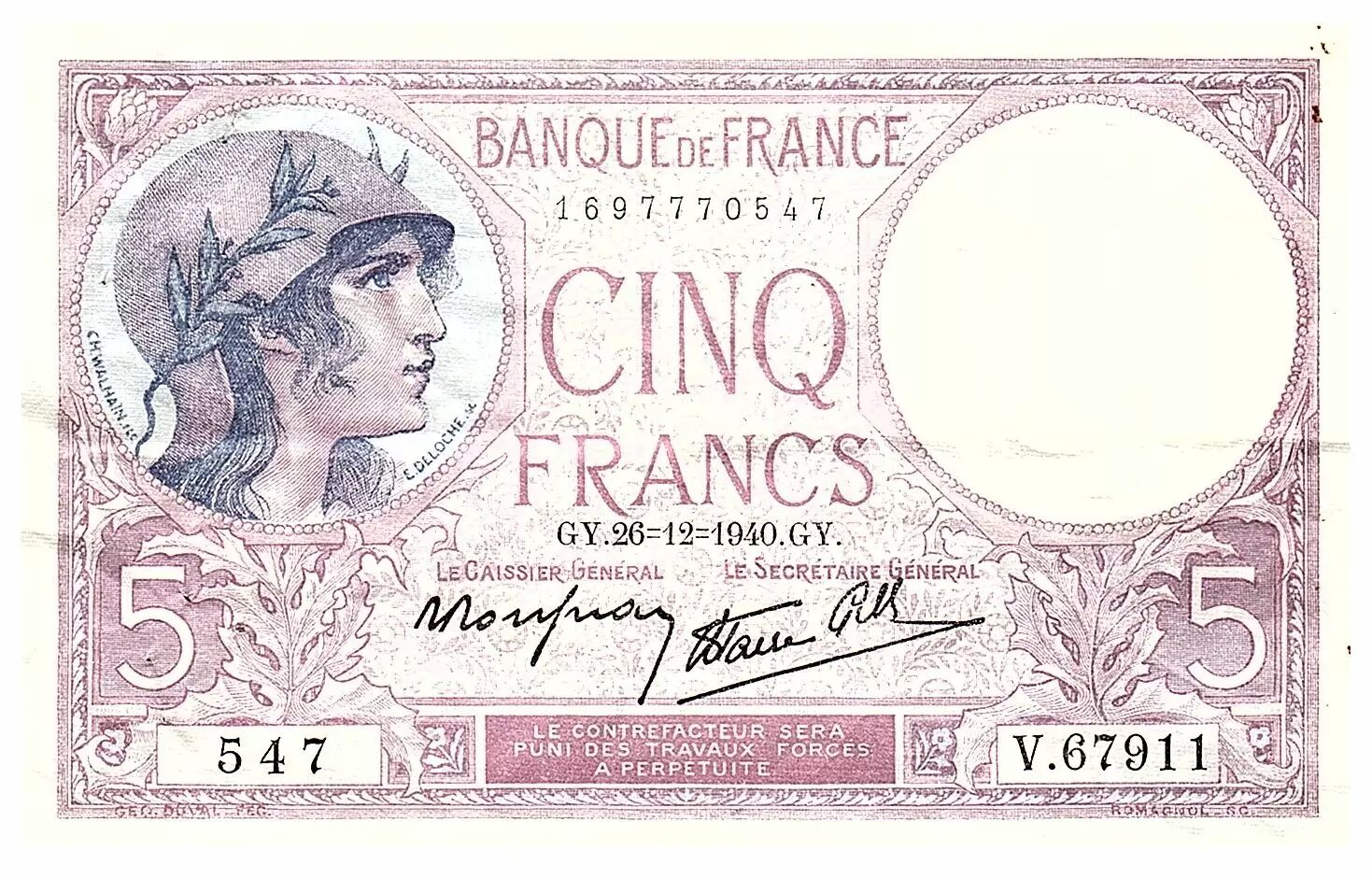 Billet France 5 Francs Femme casquée modifiée - 26-12-1940 - Série V.67911 - F.04.18
