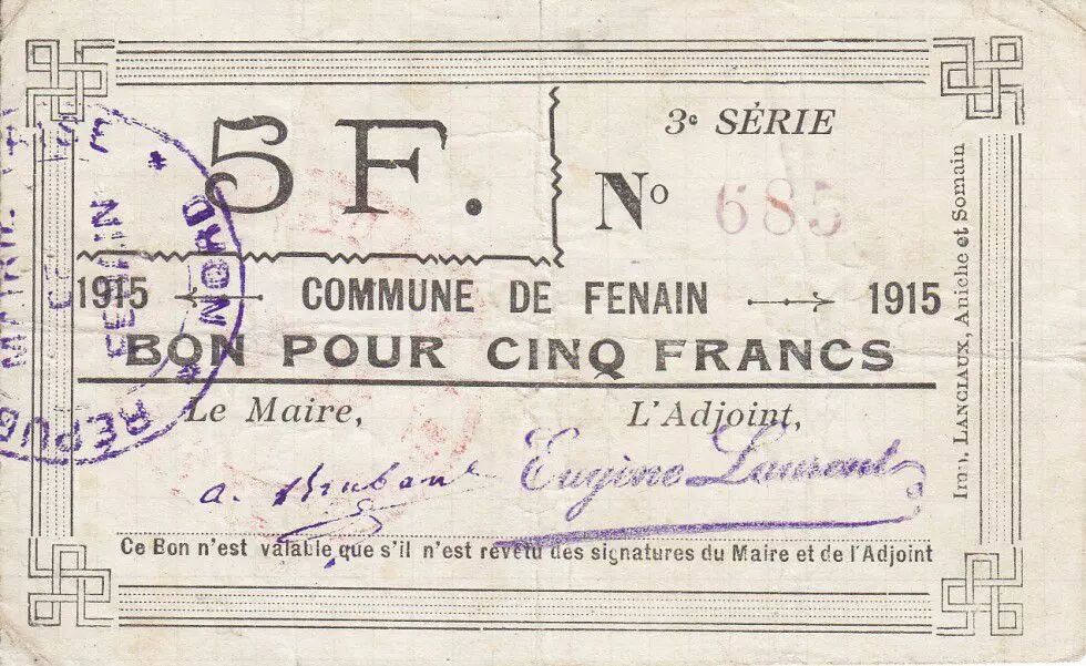 Accueil > Archivage > France 5 Francs Fenain Commune - 1915