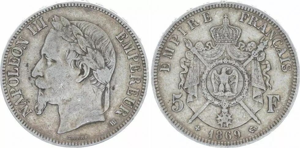 Pièce France 5 Francs France Napoléon III - Tête laurée 1869 BB Strasbourg