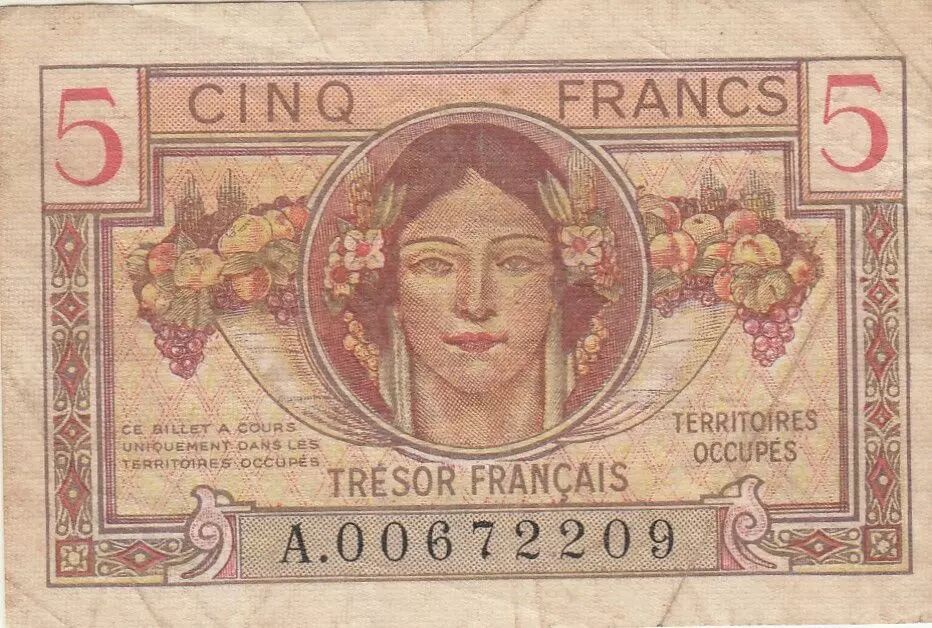 Home > > France 5 Francs - French Treasury - 1947 - Serial A.00672209