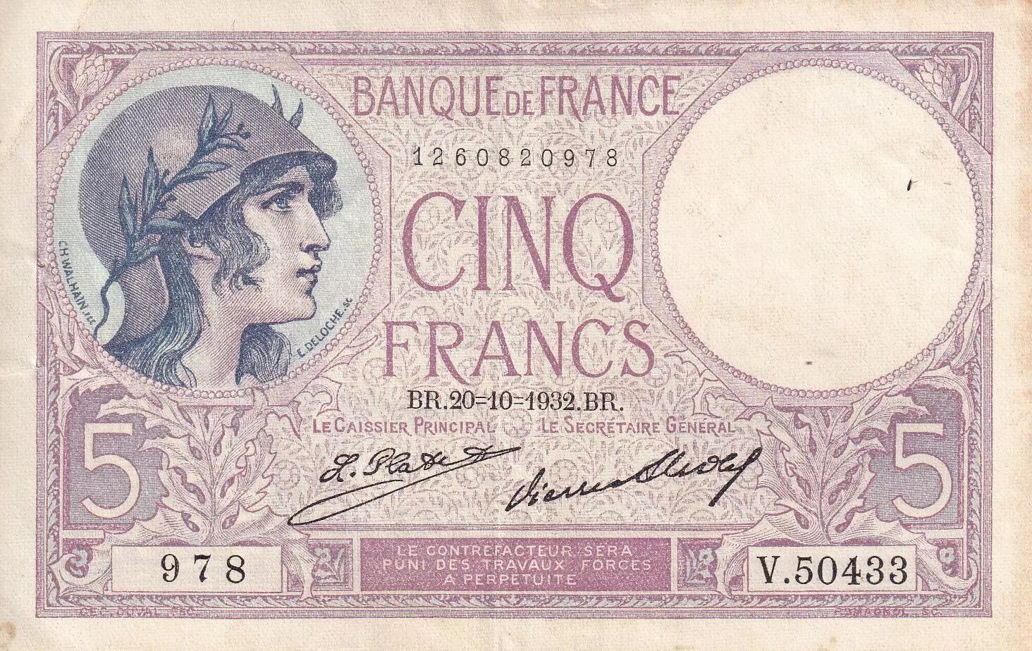 Banknote France 5 Francs - Helmeted woman - 20-10-1932 - Serial V.50433 - P.72