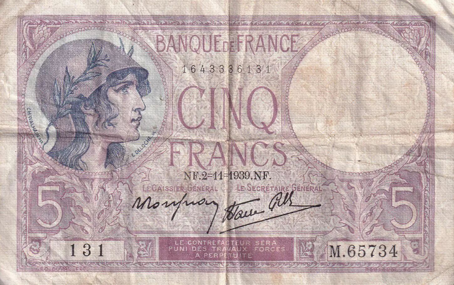 Home > French Banknotes > Bank of France Banknotes > 5 Francs Banknotes > Violet Type 1917 (1917-1940) > France 5 Francs - Helmeted woman - Differents years - serial varieties - VG to F - P.72