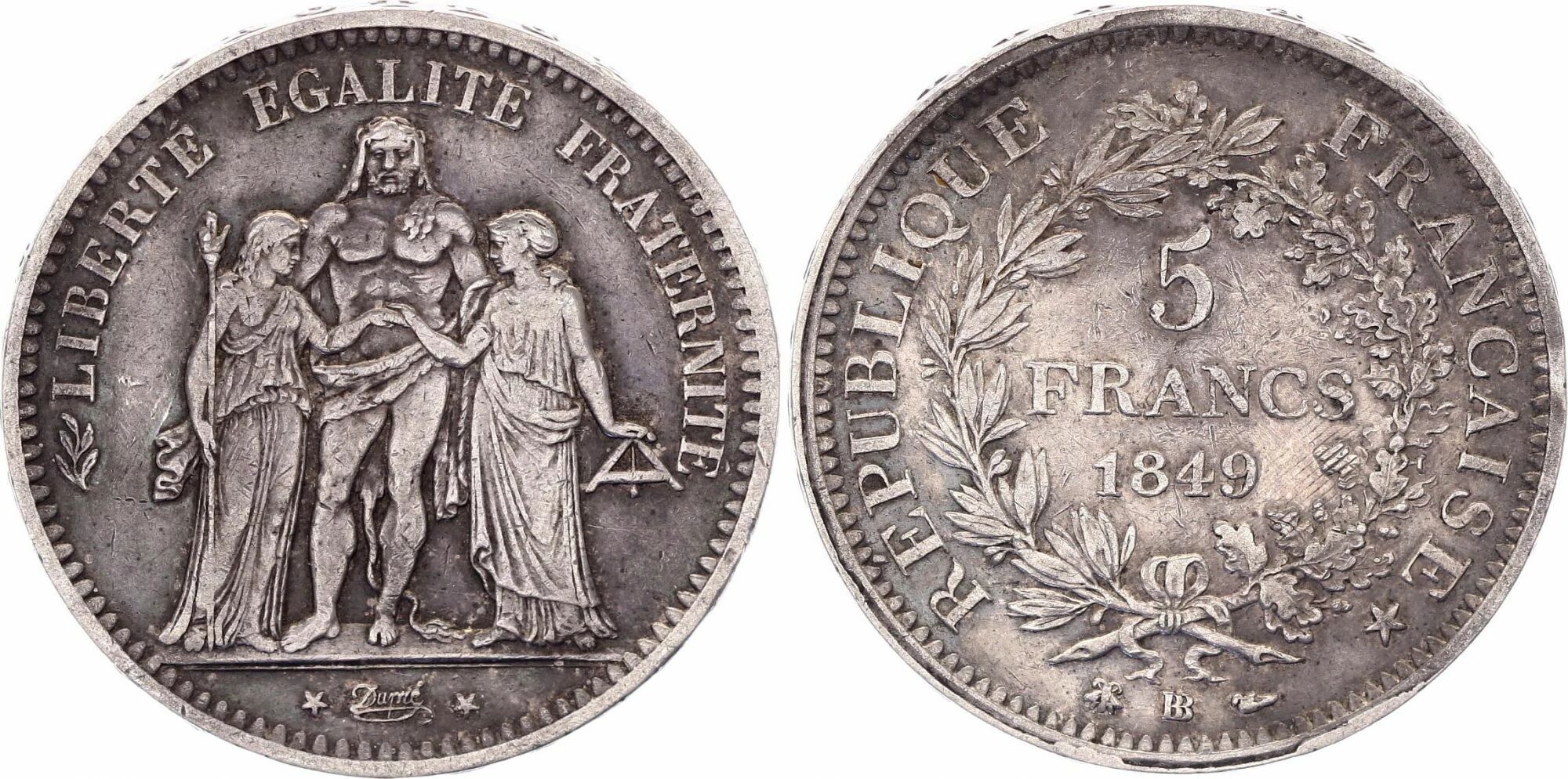 Cette pièce de monnaie est une pièce de 5 francs Hercule, frappée durant la Deuxième République française. Elle a été émise en 1849.