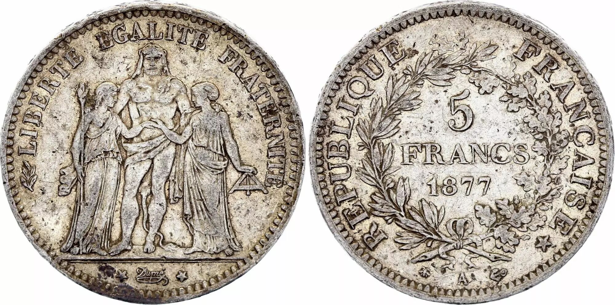 Home > French coins (470 à 2002) > Modern Currencies (1789 to 2002) > 5 Francs > France 5 Francs - Hercules - Third Republic - 1877 A Paris - Silver