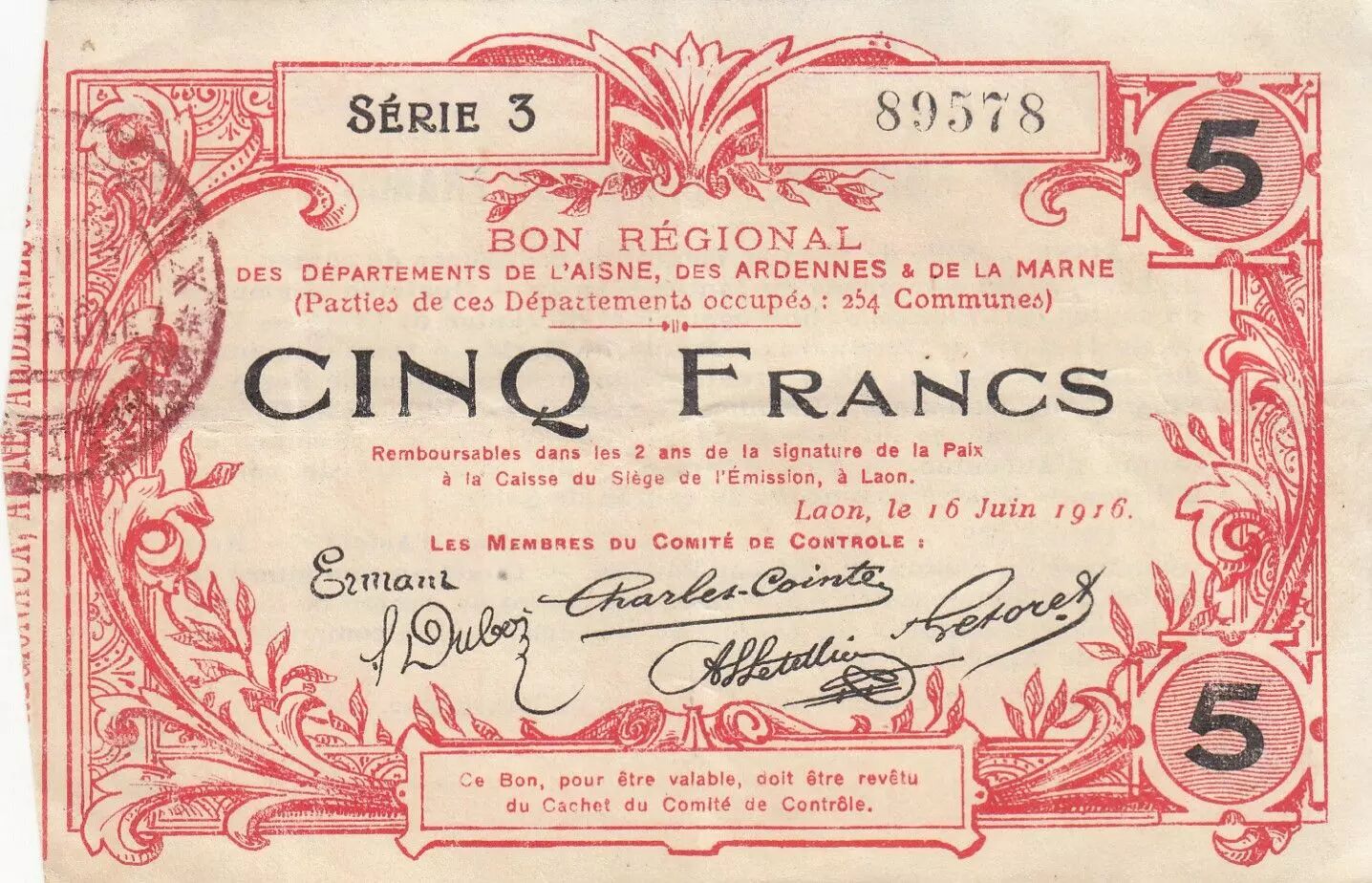 Accueil > Archivage > archivage-Billets Français > France 5 Francs - Laon - Bon Régional - 16-06-1916 - Série 3