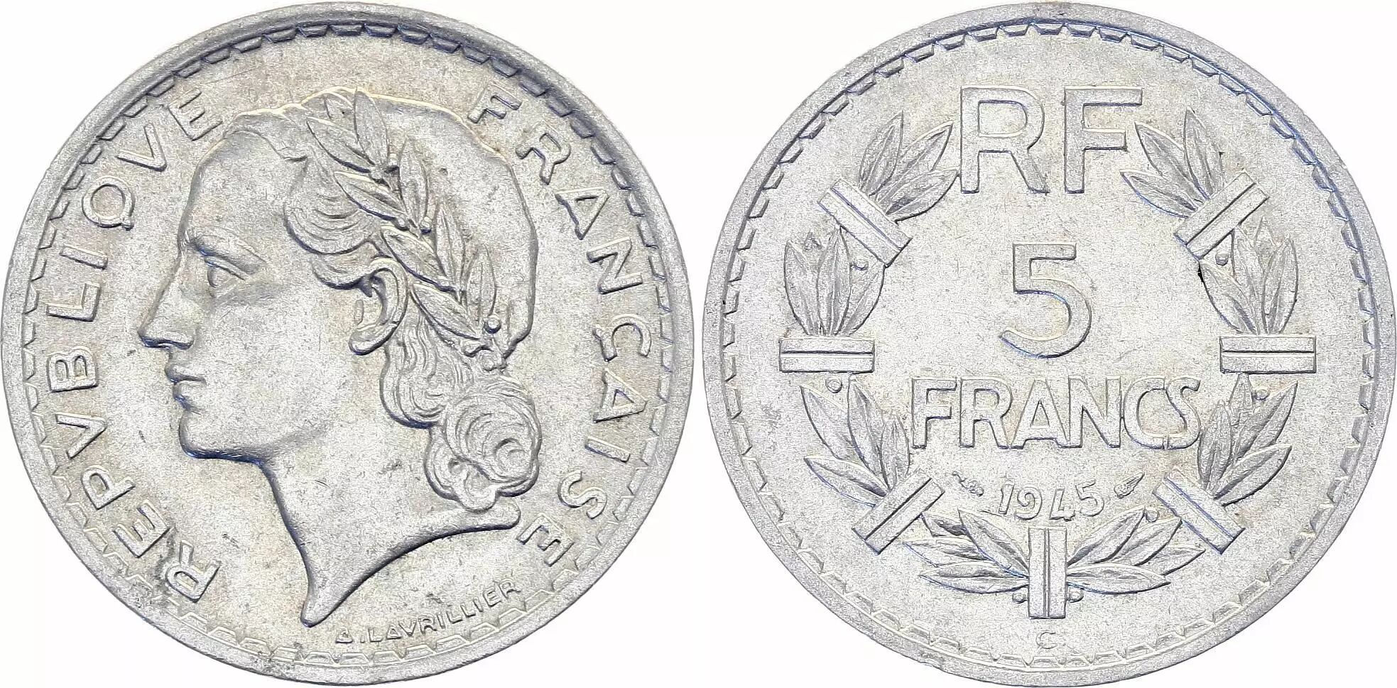 This coin is a 5 Francs coin, minted in France in 1945. It is commonly called Lavrillier, after the engraver who designed its motif.