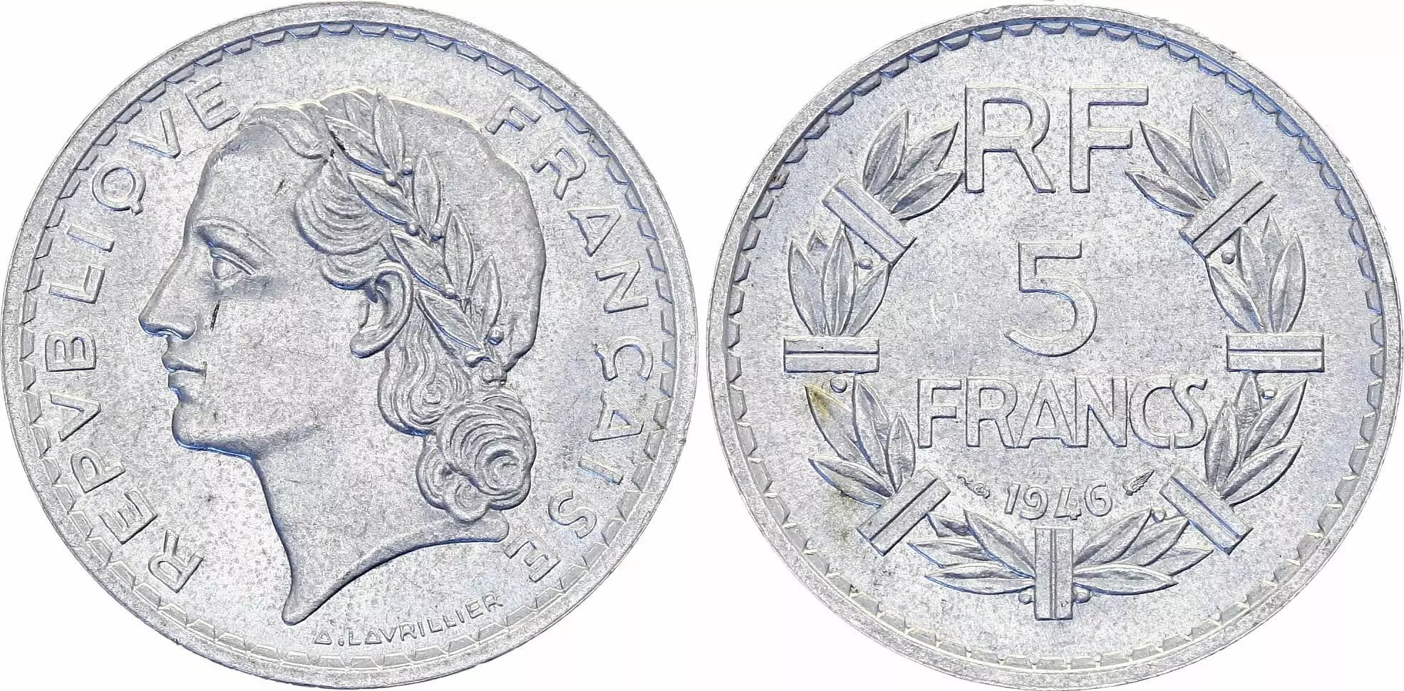 Cette pièce de monnaie est une pièce de 5 francs, frappée en France en 1946. Elle est communément appelée "Lavrillier" en raison de son concepteur, dont le nom est associé à son design.