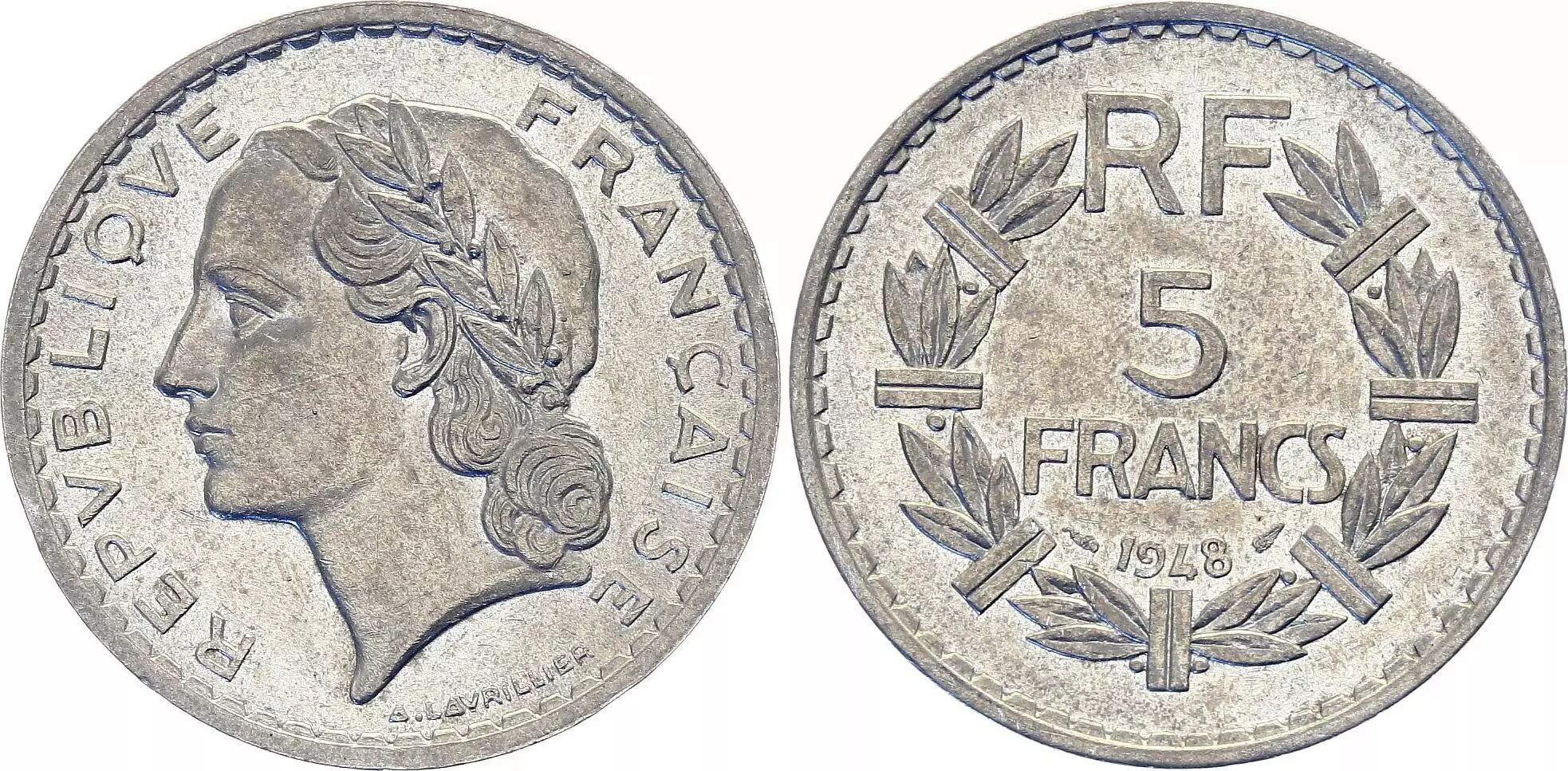The 5 Francs Lavrillier coin, minted in France in 1948, is a fractional coin. Its face value is five francs.
