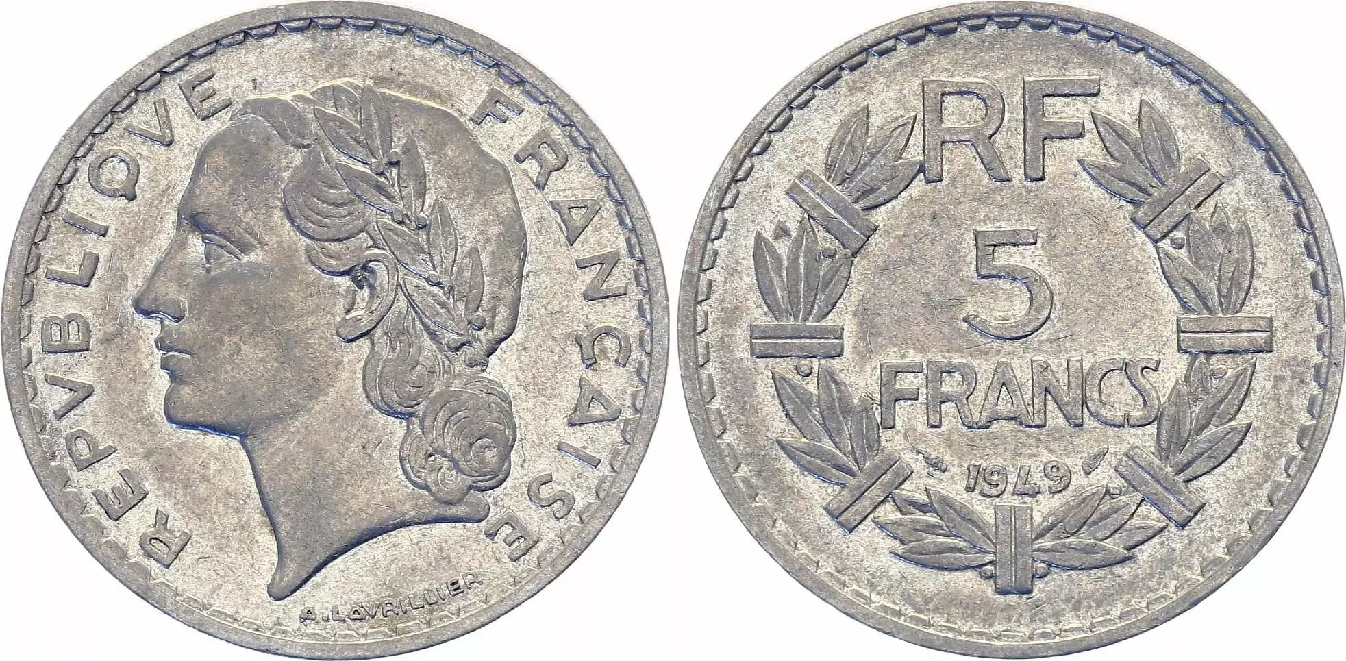The 5 Francs Lavrillier coin, dated 1949, is a coin issued by France. Its face value is 5 francs. The coin is struck in aluminum, which gives it a notable lightness. Its weight is 3.5 grams.