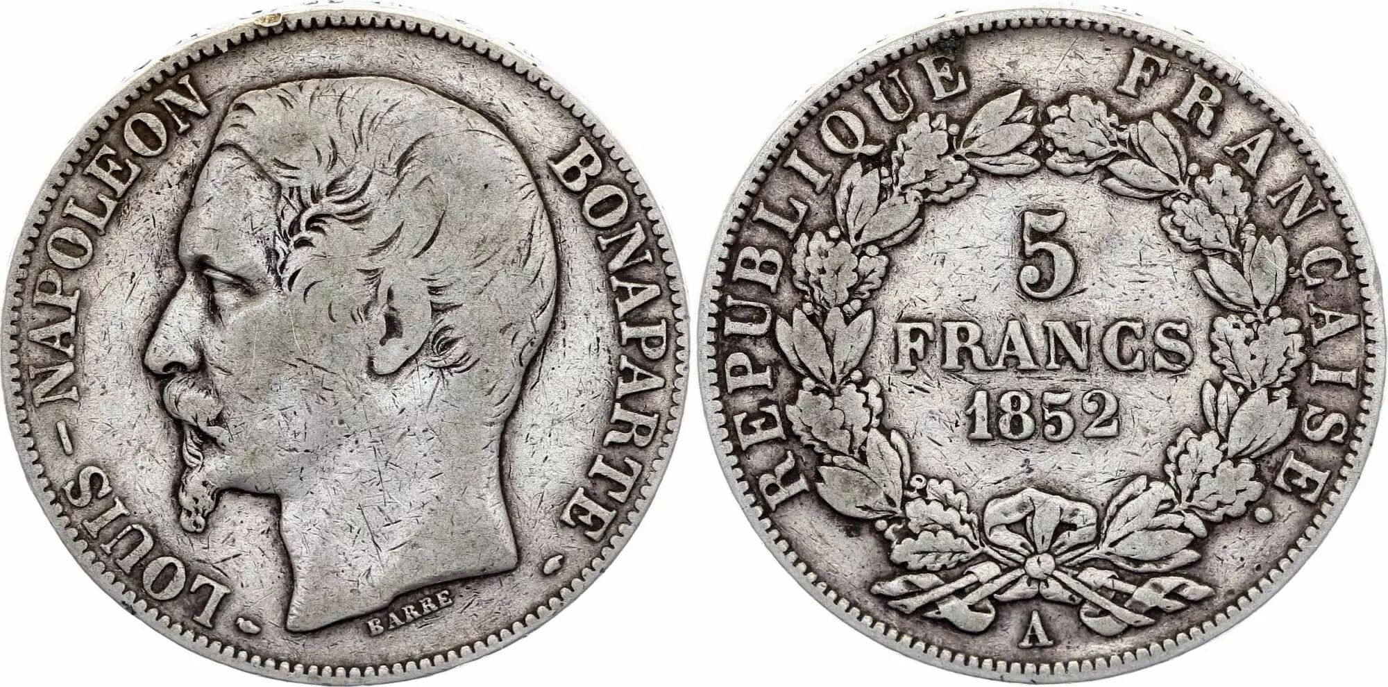 Coin France 5 Francs Louis-Napoleon Bonaparte - Large head - 1852 A Paris - Silver