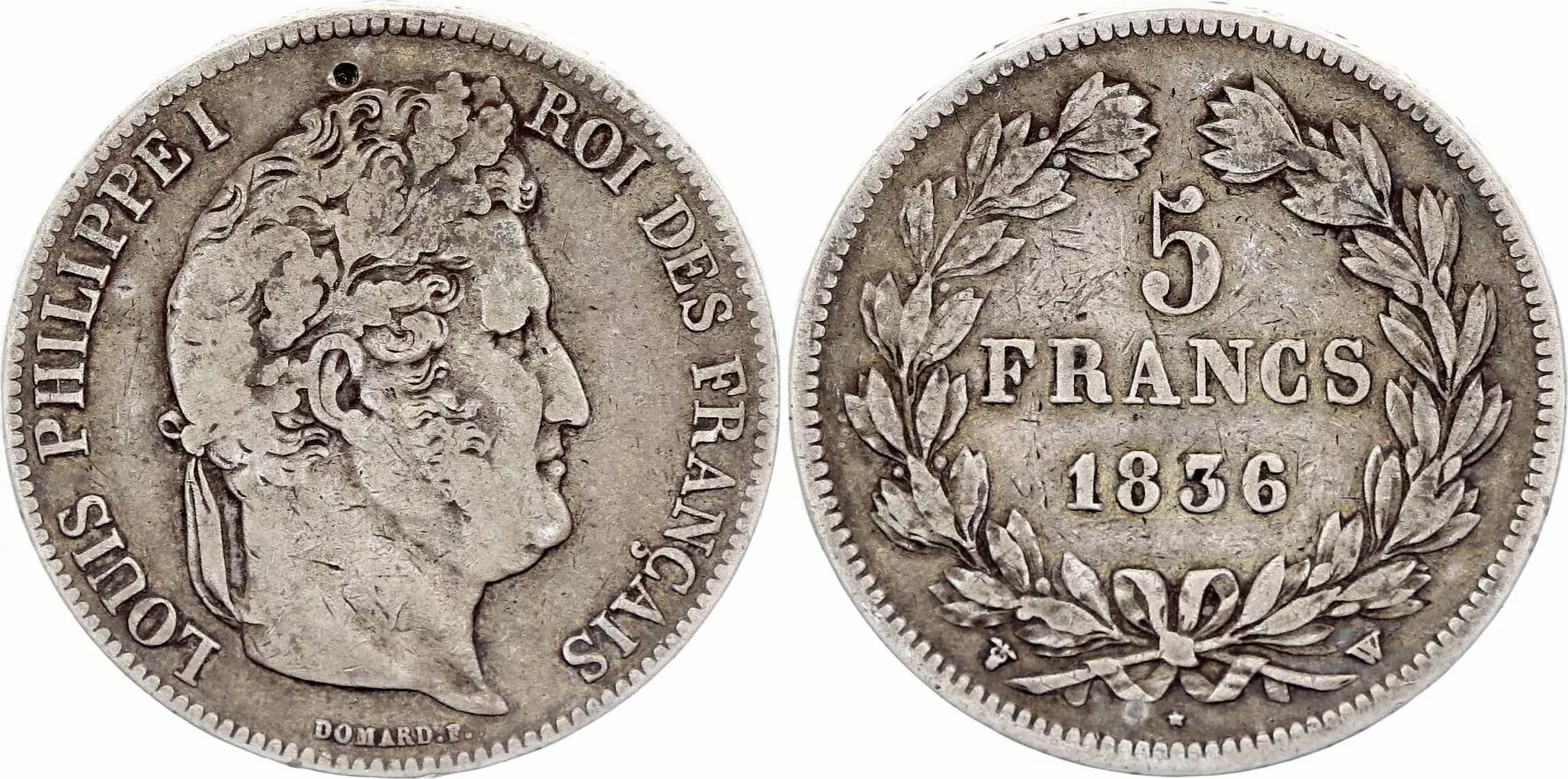 Pièce France 5 Francs Louis-Philippe I - 1836 W Lille - Argent